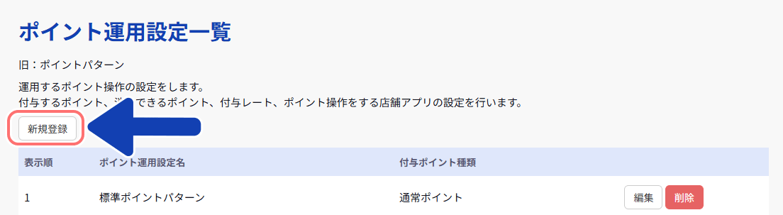 一覧表の左上にある「新規登録」ボタンをクリックします。